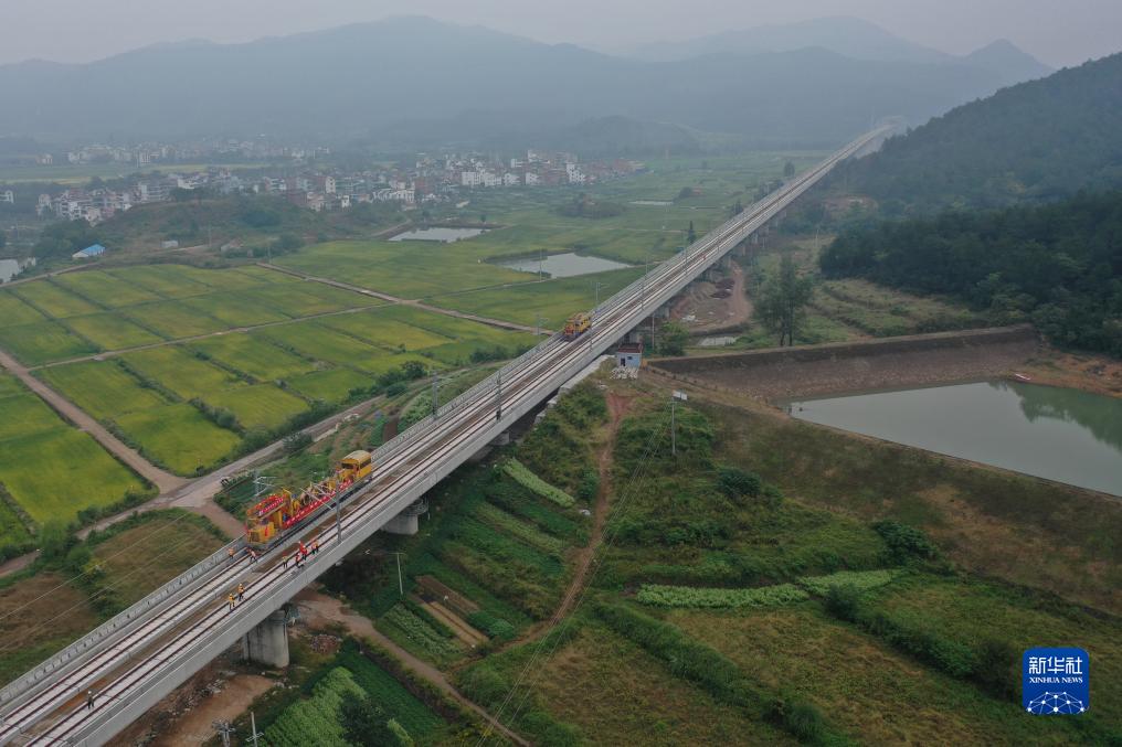 10月10日,中國中鐵電氣化局施工人員在杭溫鐵路上進(jìn)行接觸網(wǎng)導(dǎo)線架設(shè)作業(yè)(無人機(jī)照片)。
