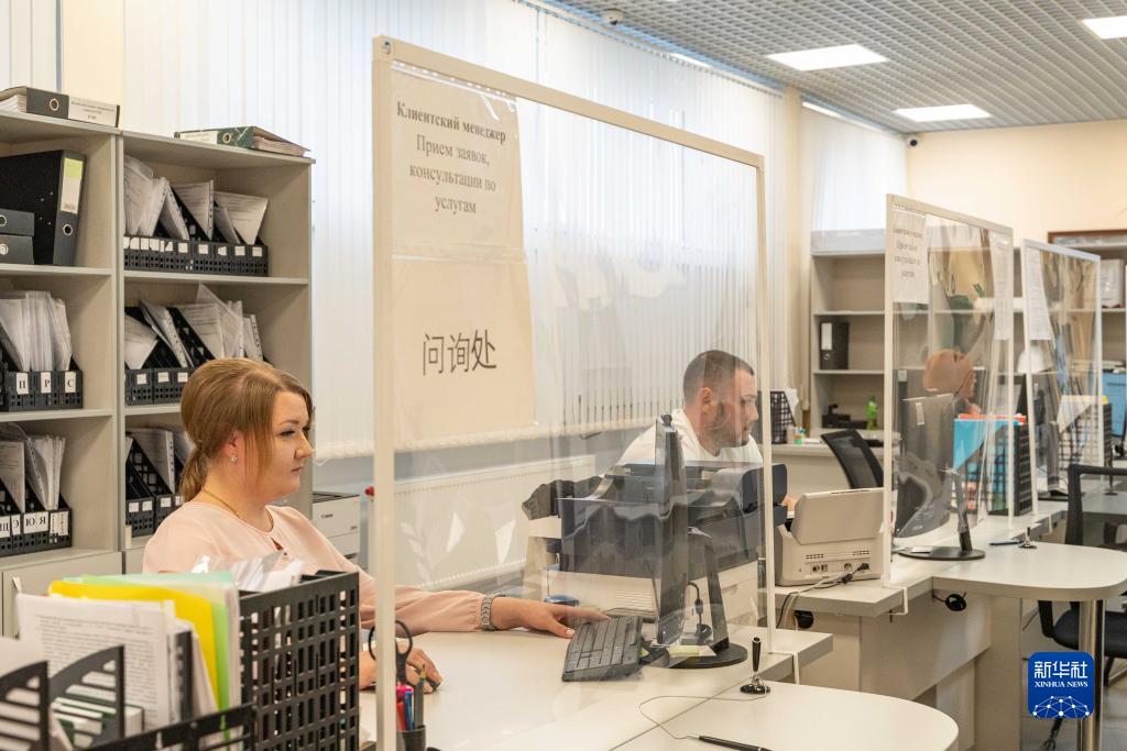 7月24日,工作人員在俄羅斯布拉戈維申斯克卡尼庫爾干海關(guān)物流口岸辦事區(qū)工作。