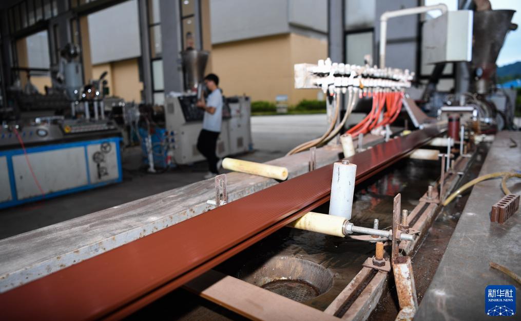 在廣東廣寧縣一家公司車間拍攝的竹纖維板材擠壓生產線(10月9日攝)。