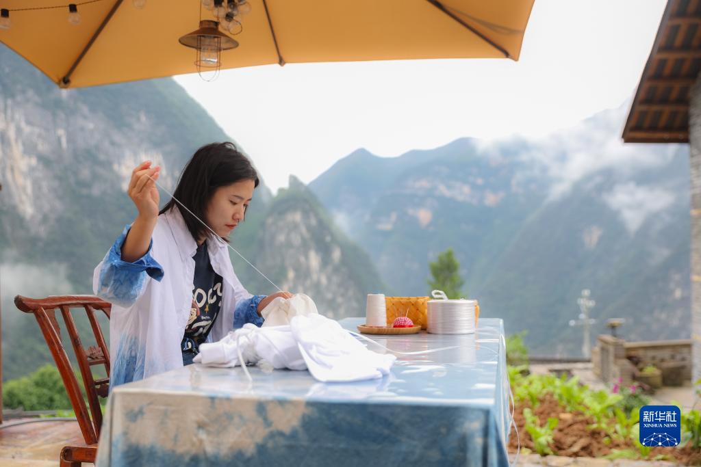 10月10日,在重慶市巫山縣竹賢鄉下莊村,袁孝鑫在創作扎染圖案。
