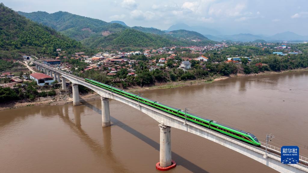 2023年5月28日,中老鐵路客運列車通過老撾瑯勃拉邦湄公河特大橋(無人機照片)。中老鐵路北起中國昆明,南抵老撾萬象,全長1035公里,是“一帶一路”共商合作、共建項目、共享紅利的生動例證。截至10月3日,中老鐵路開通運營滿22個月,累計運輸貨物2680多萬噸,其中進出境貨運量550萬噸,貨物品類增加至2700多種。