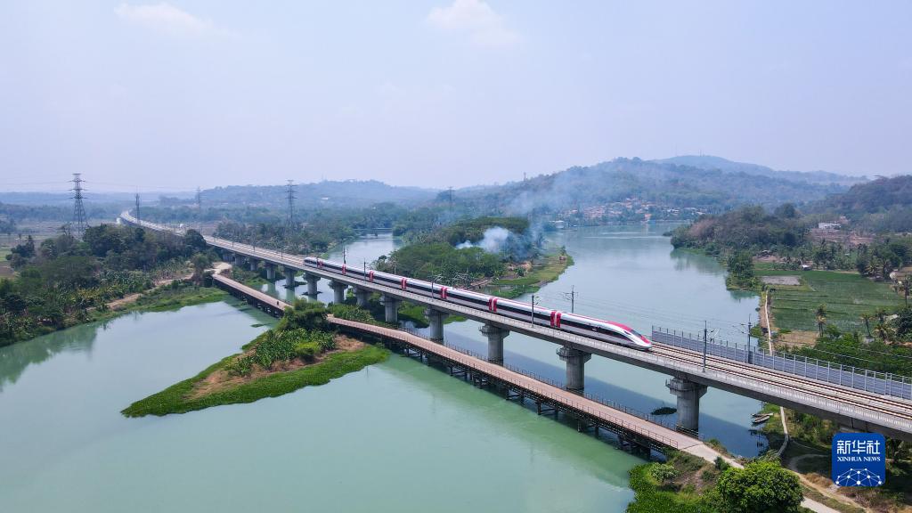 這是2023年9月30日在印度尼西亞普哇加達拍攝的一列行駛中的雅萬高鐵高速動車組(無人機照片)。雅萬高鐵是印尼和東南亞第一條高速鐵路,是中印尼兩國高度關注的共建“一帶一路”旗艦項目,是國際上首個由政府主導搭臺、兩國企業合作建設和管理的高鐵項目。