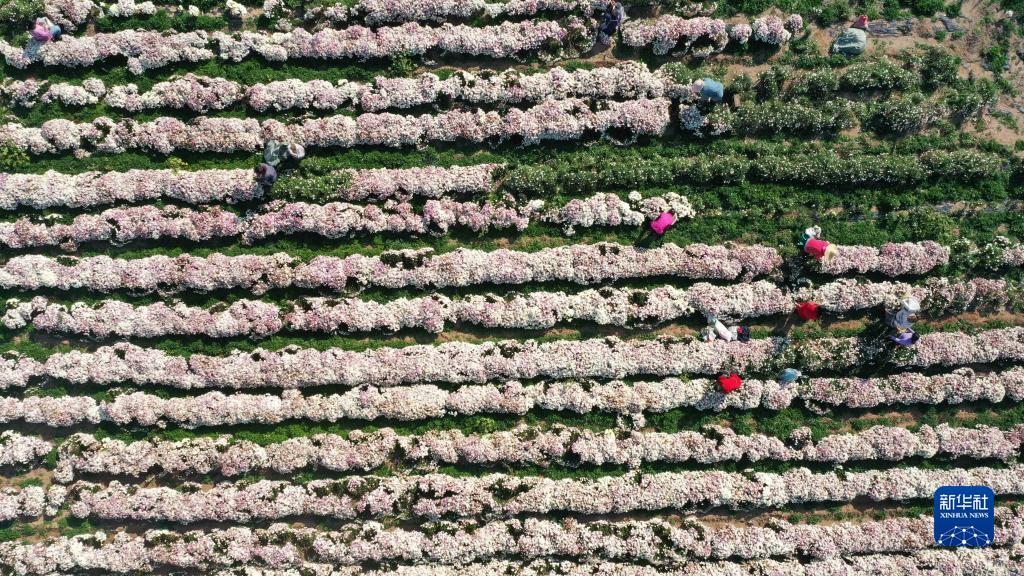 10月10日,農民在河北省石家莊市井陘礦區賈莊村太行白菊種植基地采收菊花(無人機照片)。
