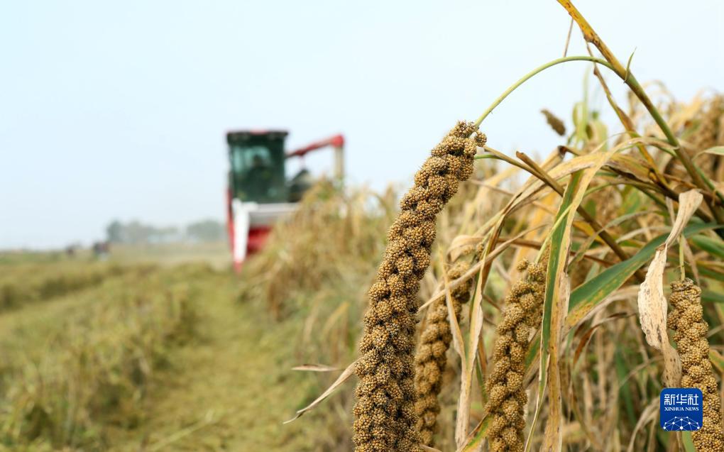 10月10日,在河南省洛陽市汝陽縣蔡店鄉(xiāng)蟒莊村高標準農(nóng)田谷子地,農(nóng)民駕駛收割機在收獲谷子。