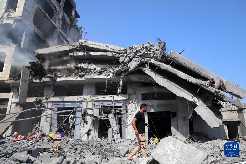 這是10月10日在加沙城拍攝的被以色列空襲炸毀的建筑廢墟。