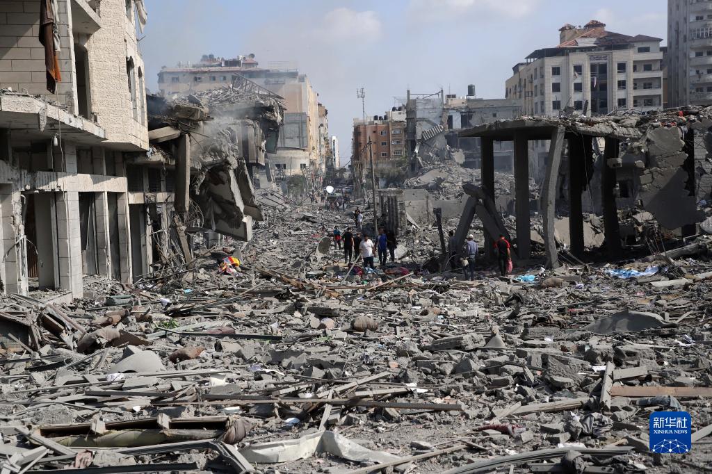 10月10日,在加沙城,人們查看被以色列空襲炸毀的建筑廢墟。