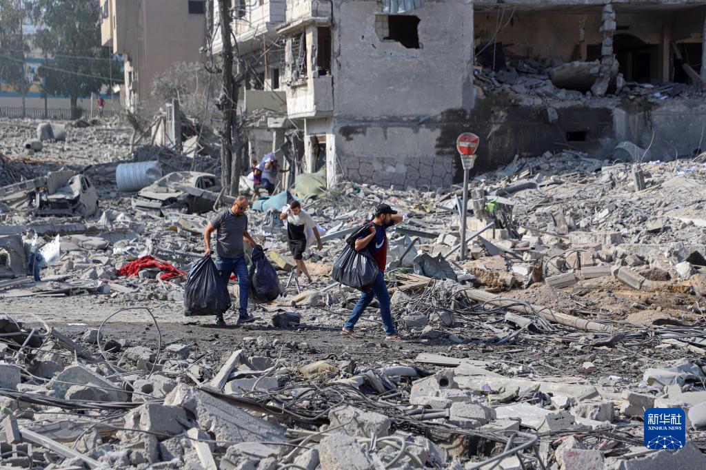 10月10日,在加沙城,人們走過被以色列空襲炸毀的建筑廢墟。