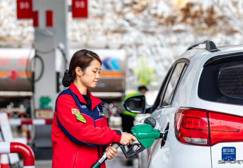 10月10日,貴州省黔西市一加油站的工作人員在為汽車加油。
