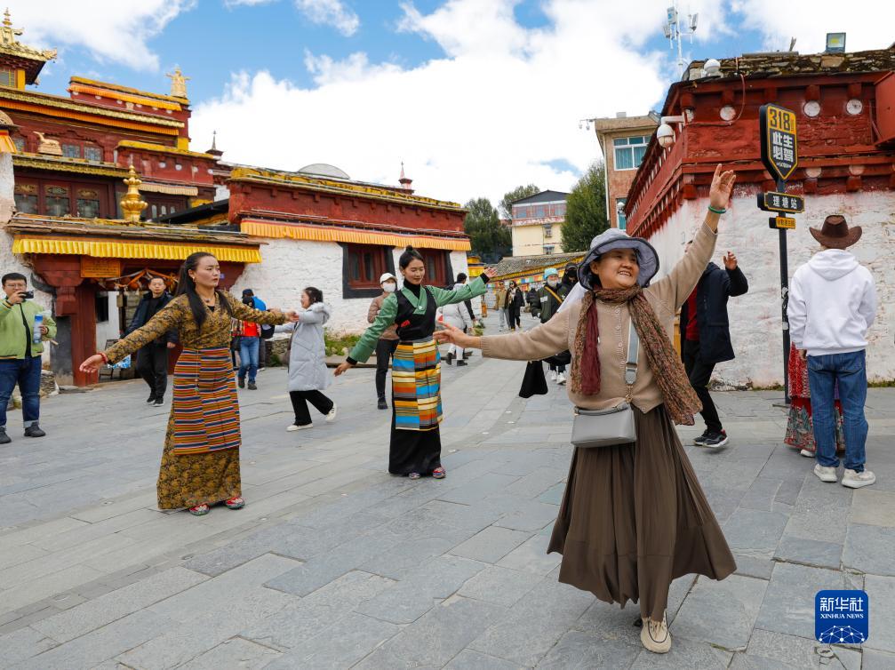 10月10日,游客(前)在理塘縣勒通古鎮(zhèn)跟著當?shù)夭刈迦罕娞伹f舞。
