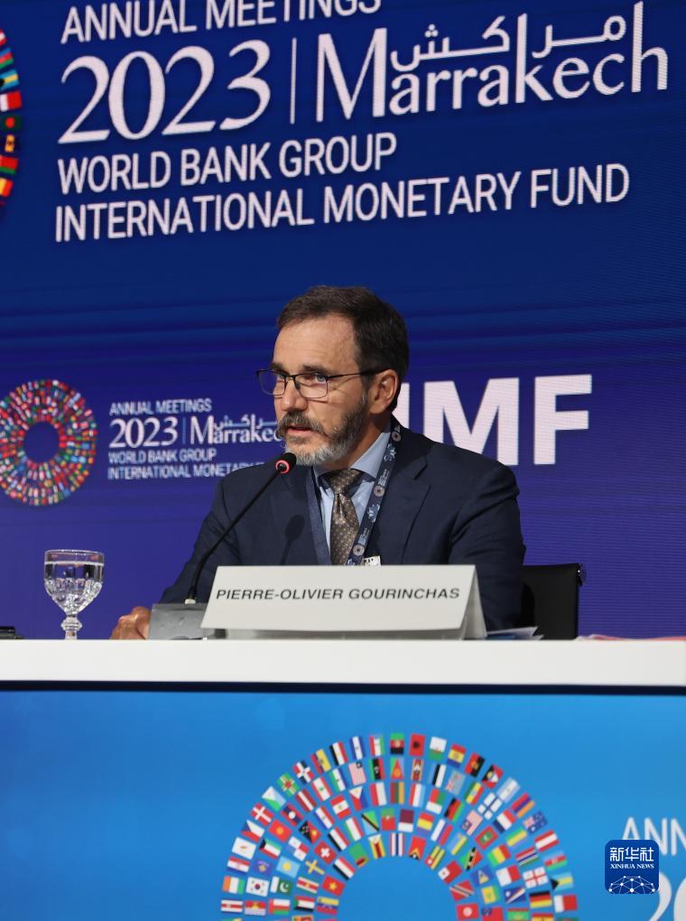 10月10日,在摩洛哥馬拉喀什,國際貨幣基金組織首席經濟學家皮埃爾-奧利維耶·古蘭沙在《世界經濟展望報告》發布會上講話。