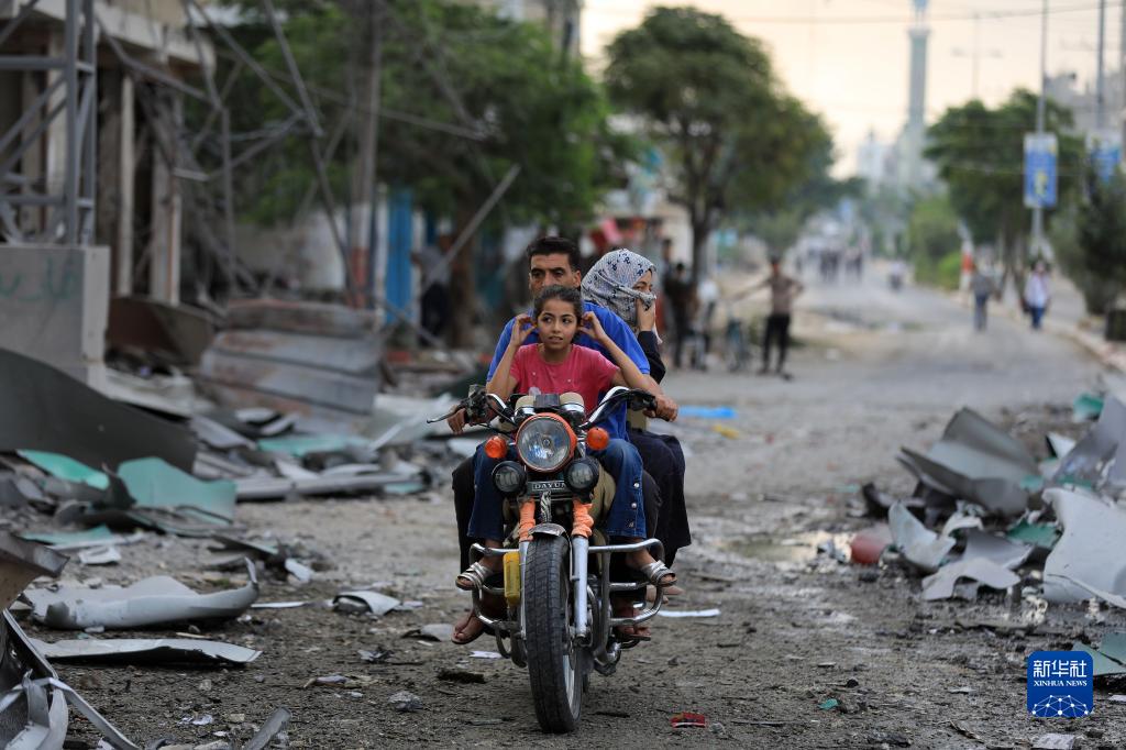 10月10日,在加沙地帶南部城市汗尤尼斯,人們在以色列空襲后在道路上騎行。