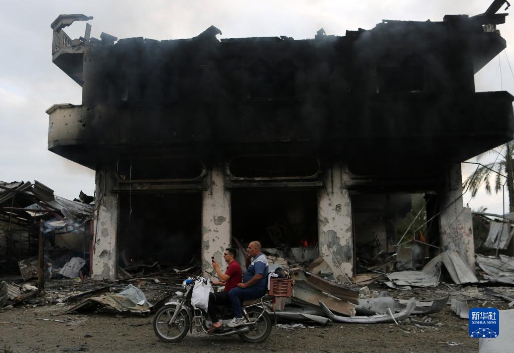 10月10日,在加沙地帶南部城市汗尤尼斯,人們經過被以色列空襲炸毀的建筑廢墟。