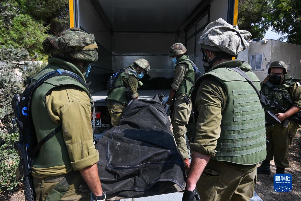 10月10日,以軍在以色列南部卡法阿扎基布茲搬運尸袋。