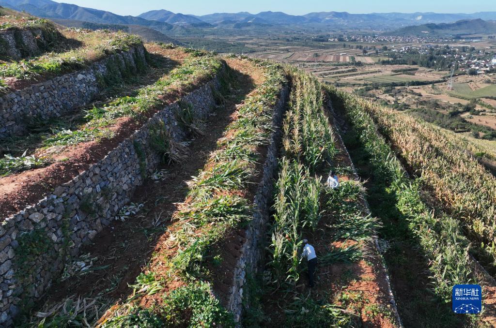 金秋時節,在河北省遵化市劉備寨鄉由丘陵坡地改造成的梯田中,農民搶抓農時收獲玉米等秋糧。近年來,遵化市大力實施土地整治工程,將淺山丘陵坡地和荒草地改造成保水保肥的水平梯田,促進農業增效、農民增收。