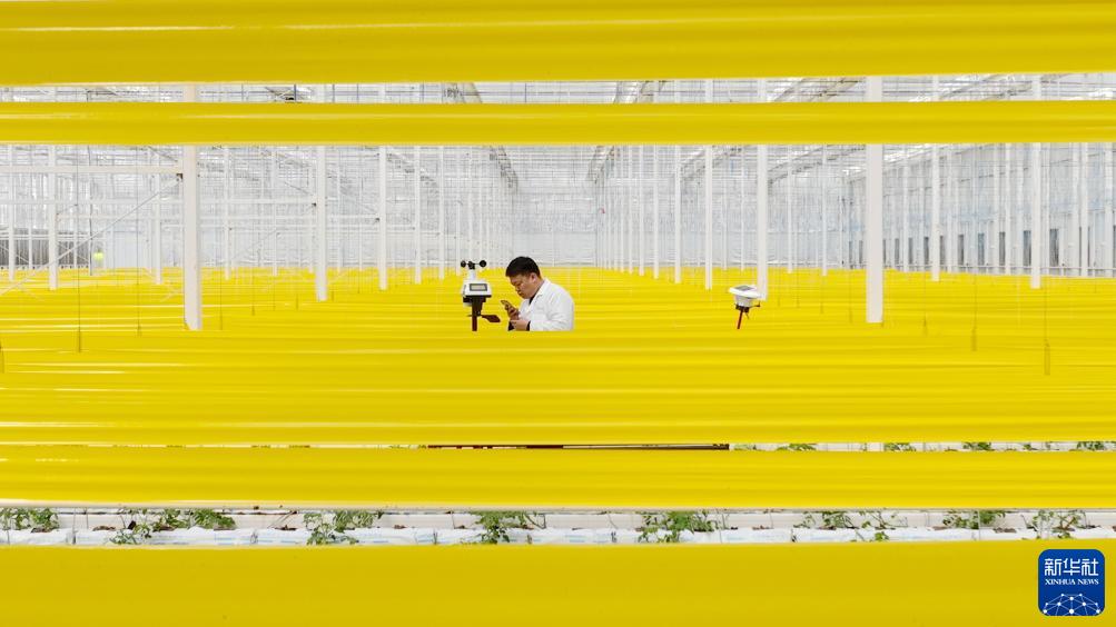 在浙江省湖州市德清縣阜溪街道龍勝村水木“未來農場”,技術人員觀察番茄智能大棚光照數據(2023年4月7日攝,無人機照片)。