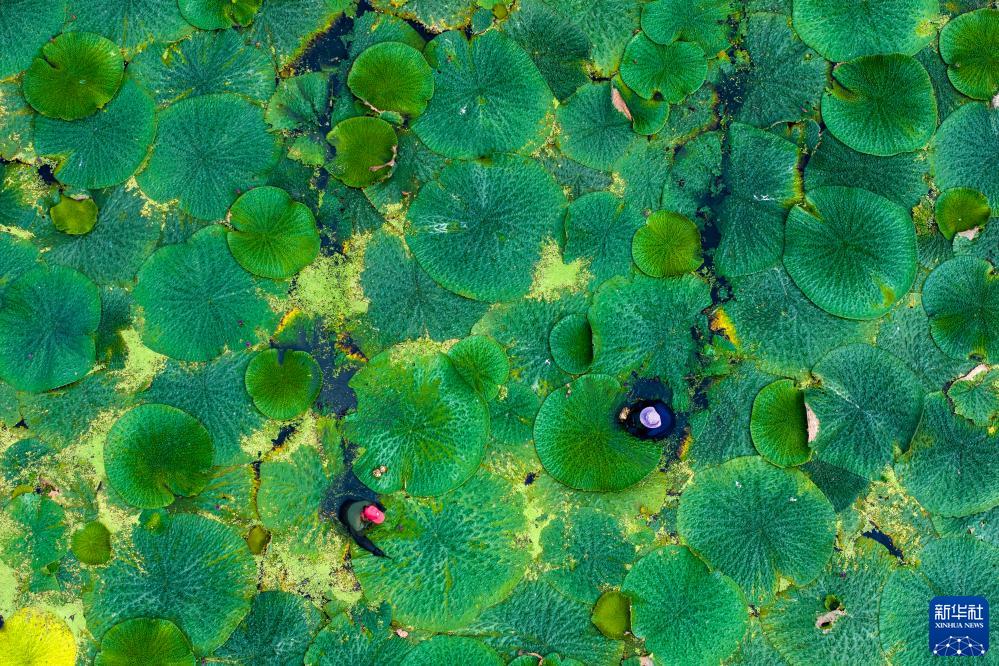 江蘇省泰州市姜堰區顧高鎮申俞村農民在采收芡實(2023年8月21日攝,無人機照片)。