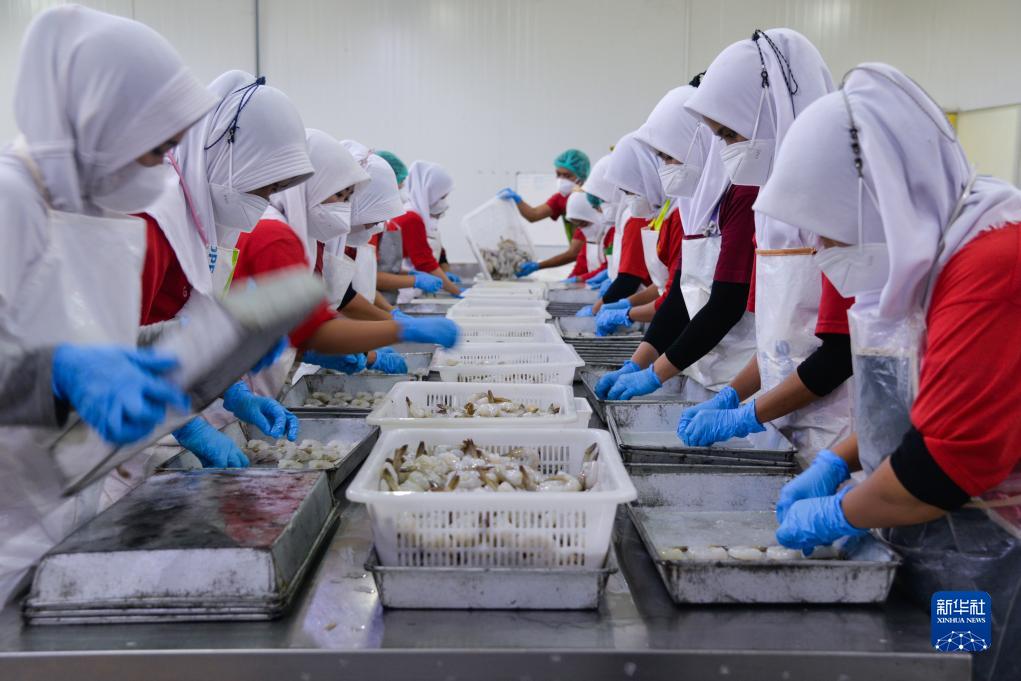2023年8月29日,在印度尼西亞中爪哇省三寶壟市,工人在福建淼天匯食品有限公司印尼公司的對蝦加工生產線上工作。