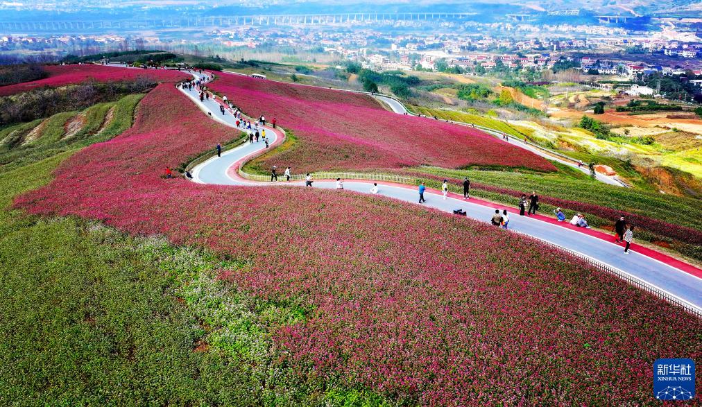 10月10日,游人在陜西省西安市藍田縣九間房鎮峪口村蕎麥嶺賞花游玩(無人機照片)。