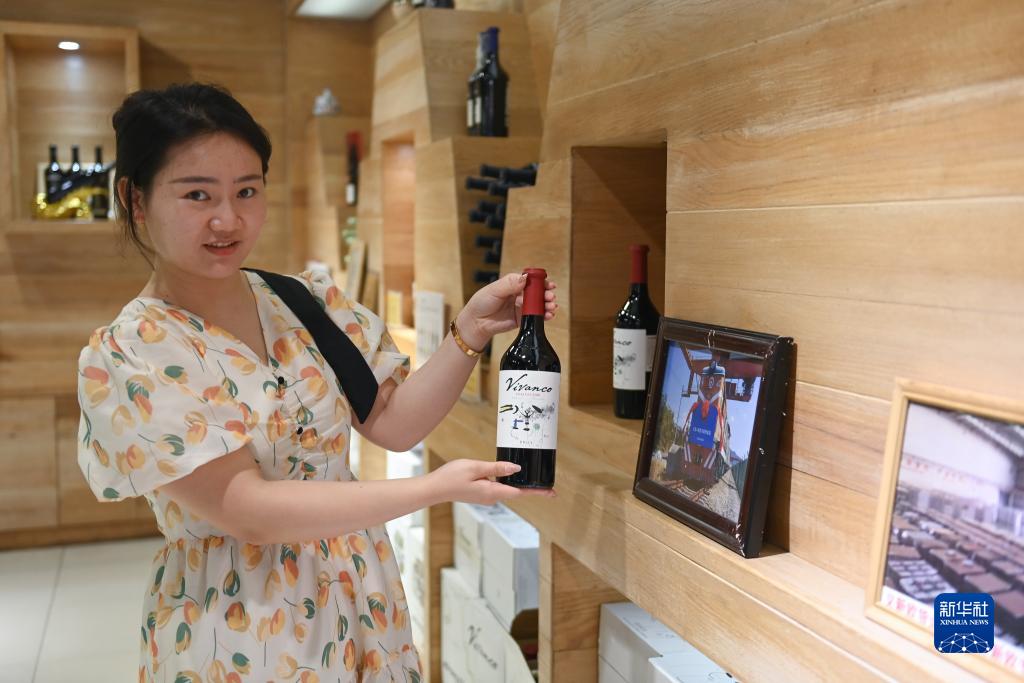 7月18日,義烏國際商貿城店員展示通過“義新歐”中歐班列進口的西班牙紅酒。