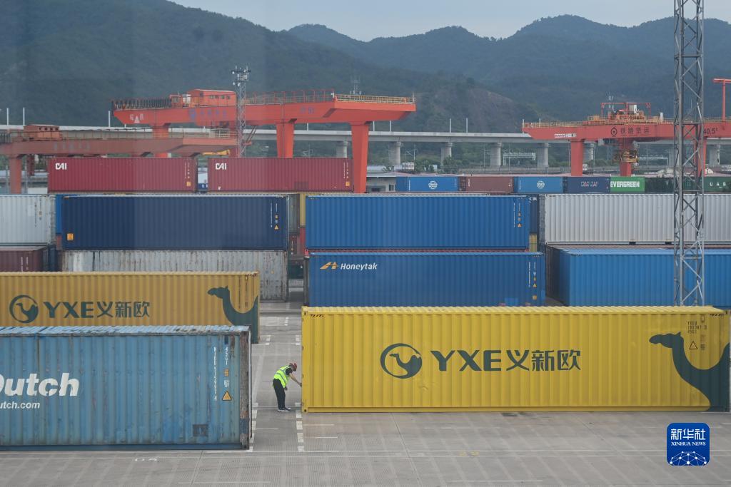 7月18日,工作人員在浙江義烏西站檢查“義新歐”集裝箱。