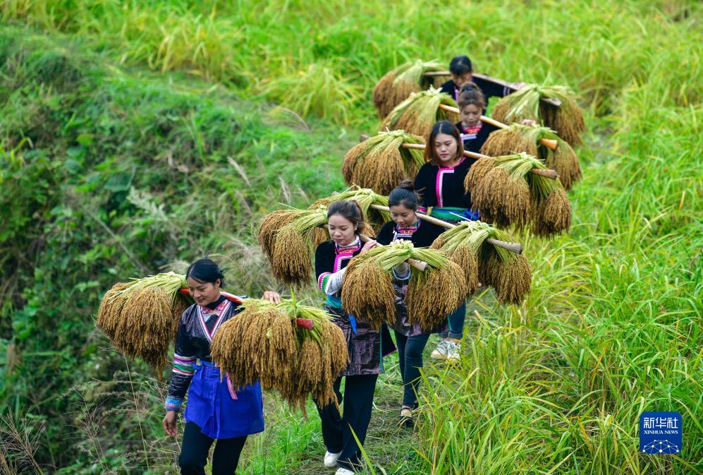 10月11日,村民在貴州省從江縣高增鄉(xiāng)建華村挑運香禾糯稻谷。