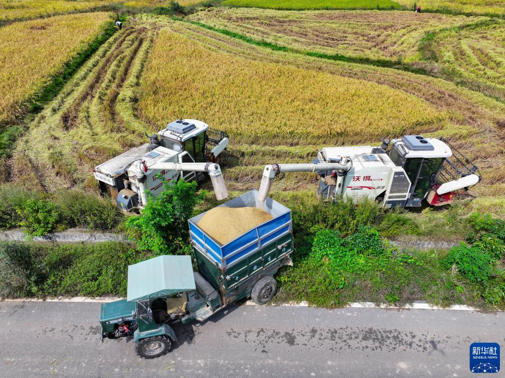 金秋時節,湖南省長沙市望城區烏山街道維梓村種植的中稻迎來收獲季,當地農戶搶抓農時收割水稻、烘干稻谷,確保顆粒歸倉。