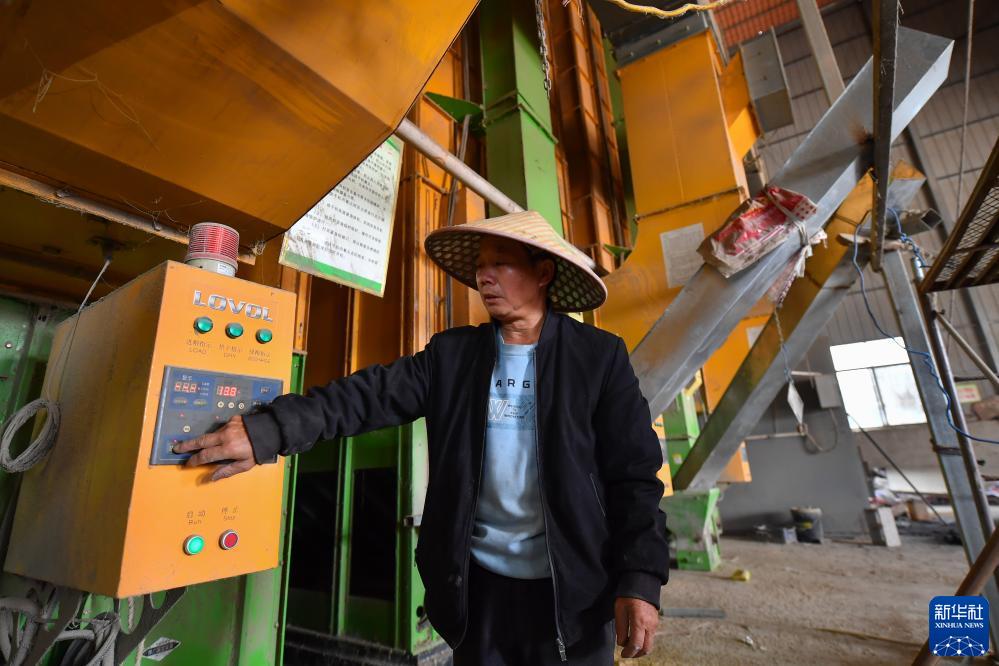 10月11日,在湖南省長沙市望城區烏山街道維梓村,農戶檢查烘干機運行情況。