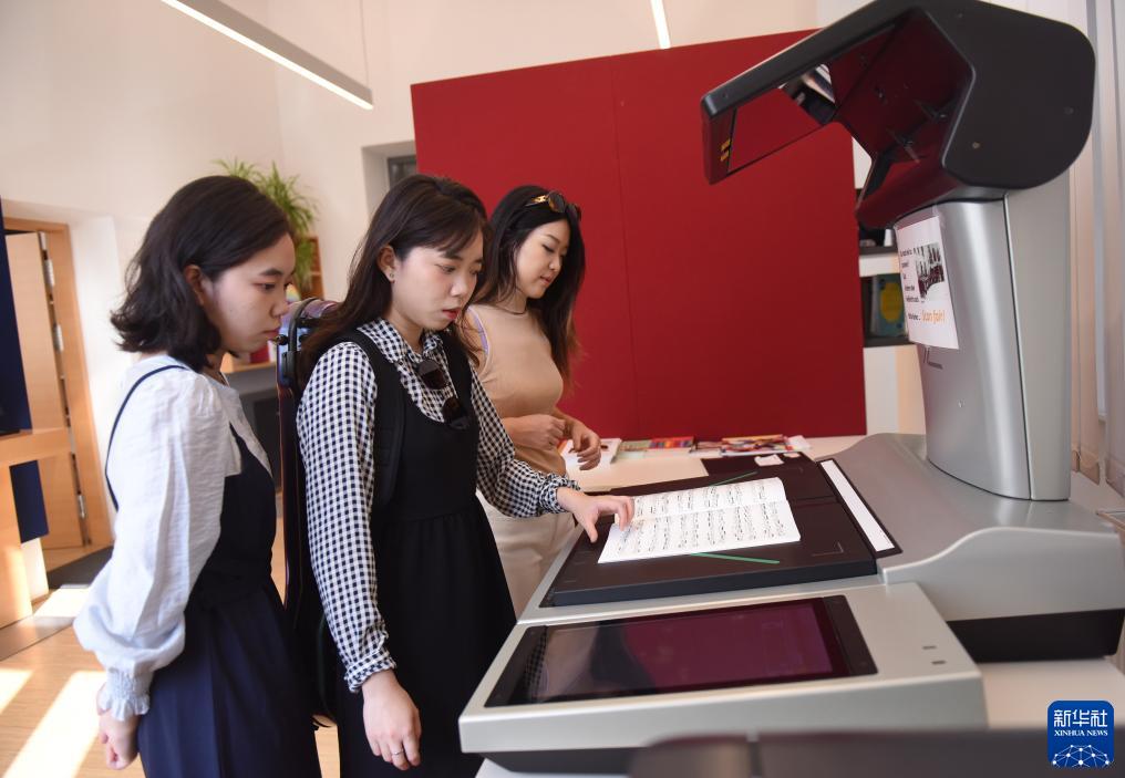9月13日,中國留學生黃韻瑜(左)、黃韻文(中)、王嘉曦在維也納國立音樂與表演藝術大學圖書館掃描樂譜。