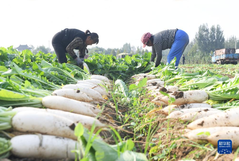 10月11日,河北省石家莊新樂(lè)市堅(jiān)固村農(nóng)民在收獲白蘿卜。