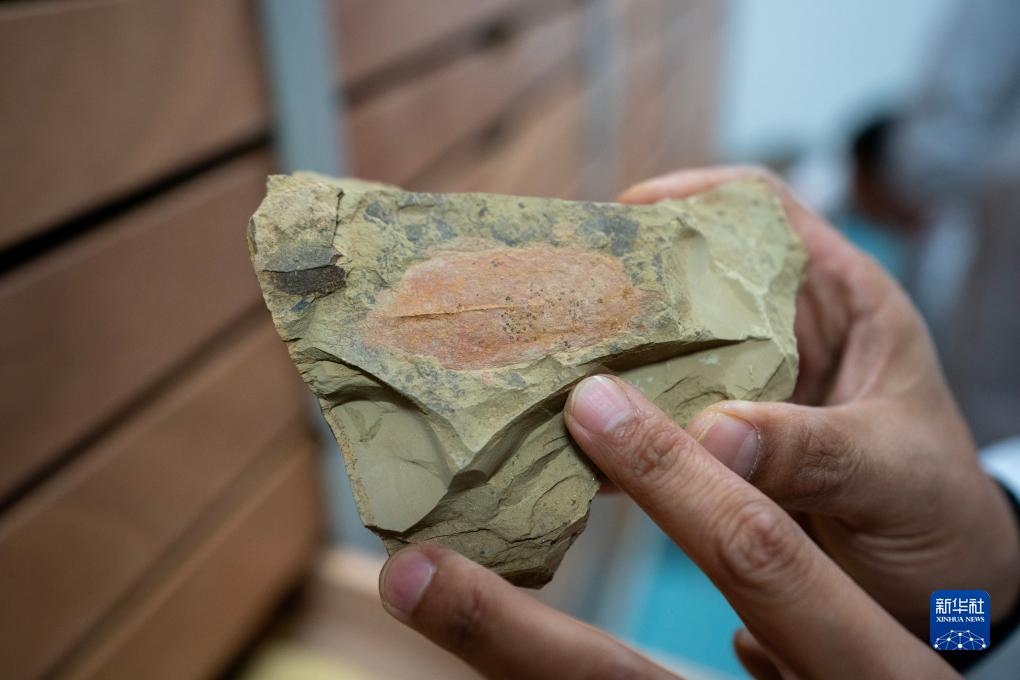 10月11日,云南大學古生物研究院研究員劉煜在化石存放庫里展示一塊化石。
