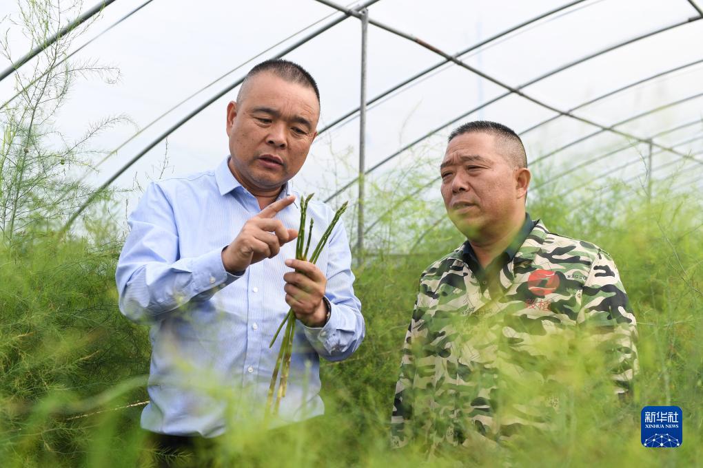 10月11日,在漣水縣紅窯鎮(zhèn)金城村,淮安市人大代表鄭標(左)給蘆筍種植戶傳授管護知識。鄭標是當?shù)靥J筍種植大戶,帶領許多村民走上種植蘆筍之路。