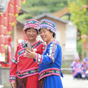 10月10日,在重慶市石柱土家族自治縣橋頭鎮(zhèn)的陶然居瓦屋小寨,當(dāng)?shù)卮迕裆碇褡宸b準(zhǔn)備迎候游客到來。