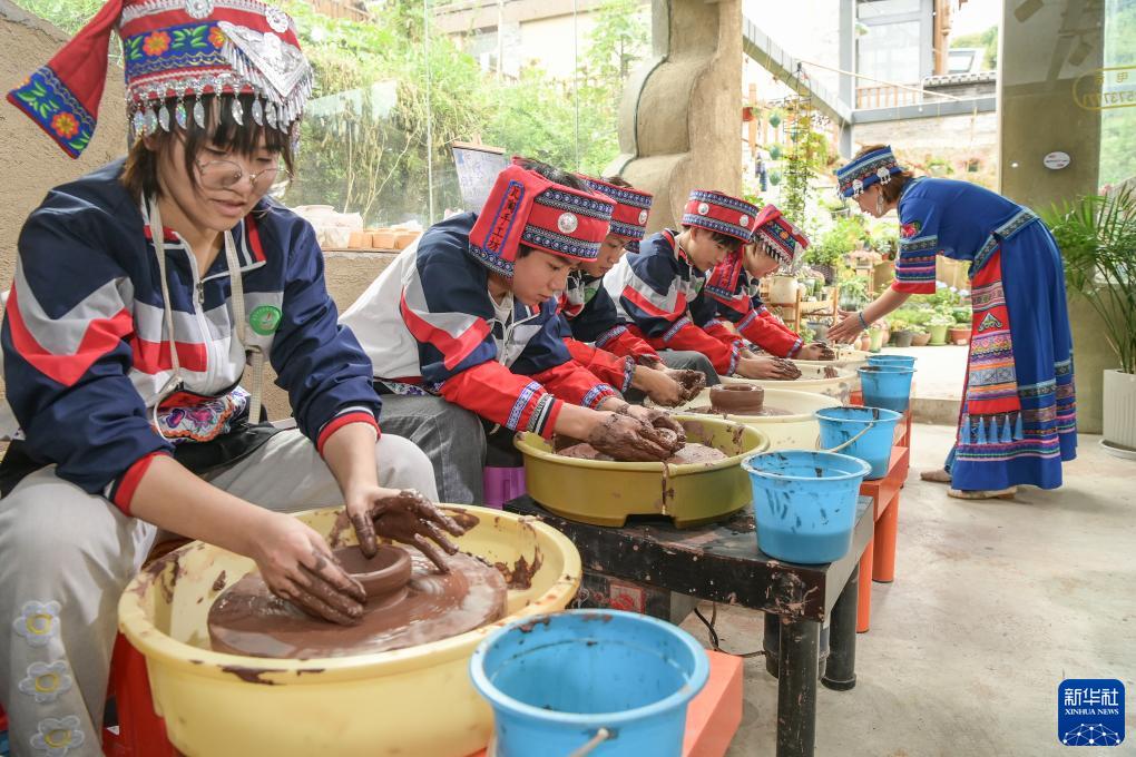 10月10日,來自重慶梁平職教中心的學生們在橋頭鎮的陶然居瓦屋小寨陶藝手工坊內體驗陶藝制作。