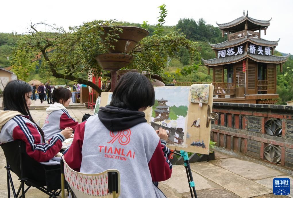 10月10日,來自重慶天籟藝術學校的學生們在橋頭鎮的陶然居瓦屋小寨內進行風景繪畫寫生。小寨優美的環境吸引了不少學校在此設立寫生基地。