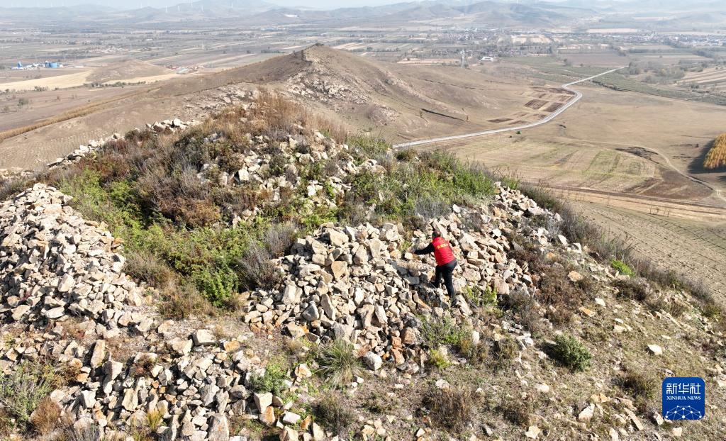 10月11日,關(guān)富軍攀上長城一座烽火臺巡查(無人機照片)。