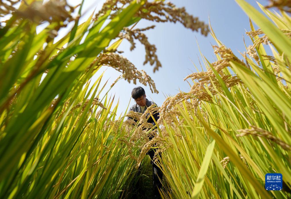 10月11日,農業科研人員在河北省唐山市曹妃甸區第五農場鹽堿地改良而成的高標準稻田內工作。