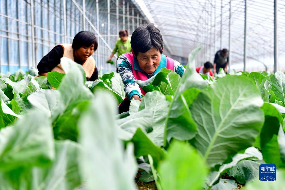 10月11日,村民在山東省惠民縣奧豐瓜菜種植專業(yè)合作社蔬菜大棚管護(hù)蔬菜。