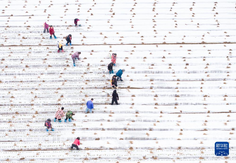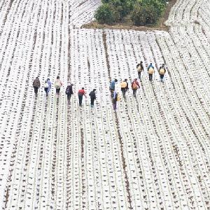 10月11日,在蓬安縣錦屏鎮(zhèn)中壩社區(qū)蔬菜種植基地,村民在田地里進行蘿卜幼苗“破膜露苗”作業(yè)(無人機照片)。