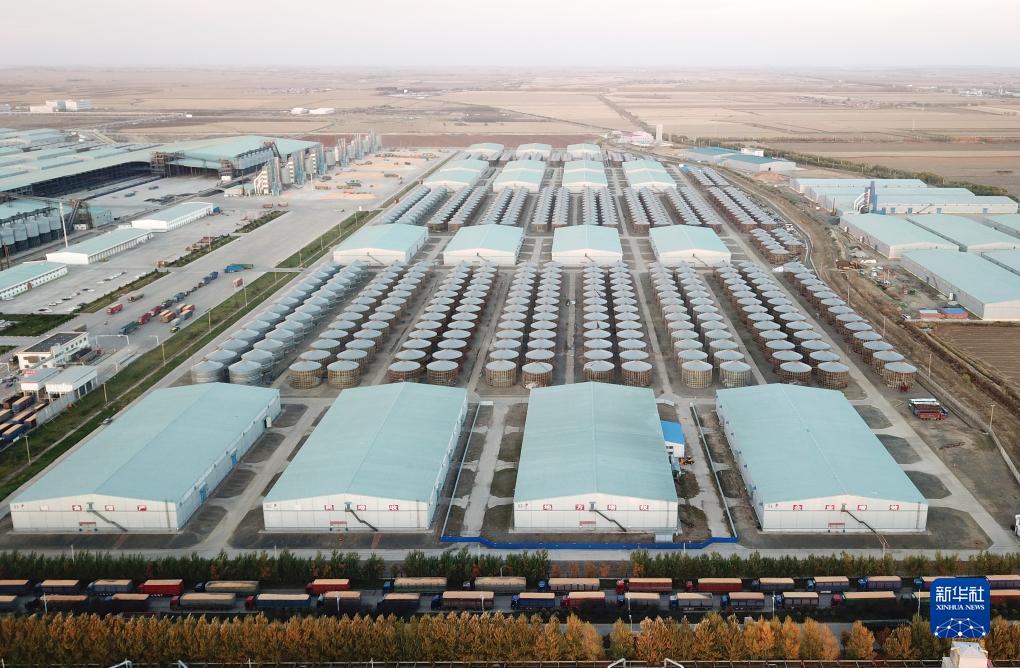 10月11日,送糧車在黑龍江省富錦市一大型糧食倉儲加工企業外排起長隊(無人機照片)。