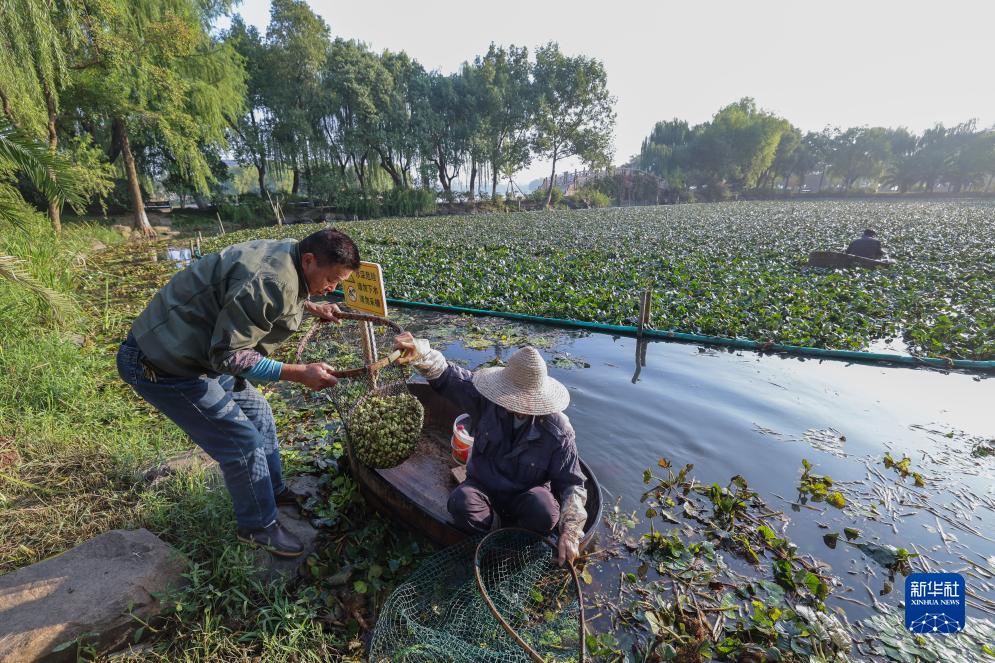 10月12日清晨,種植戶把剛采摘的新鮮南湖菱拿上岸,準備送去銷售點。