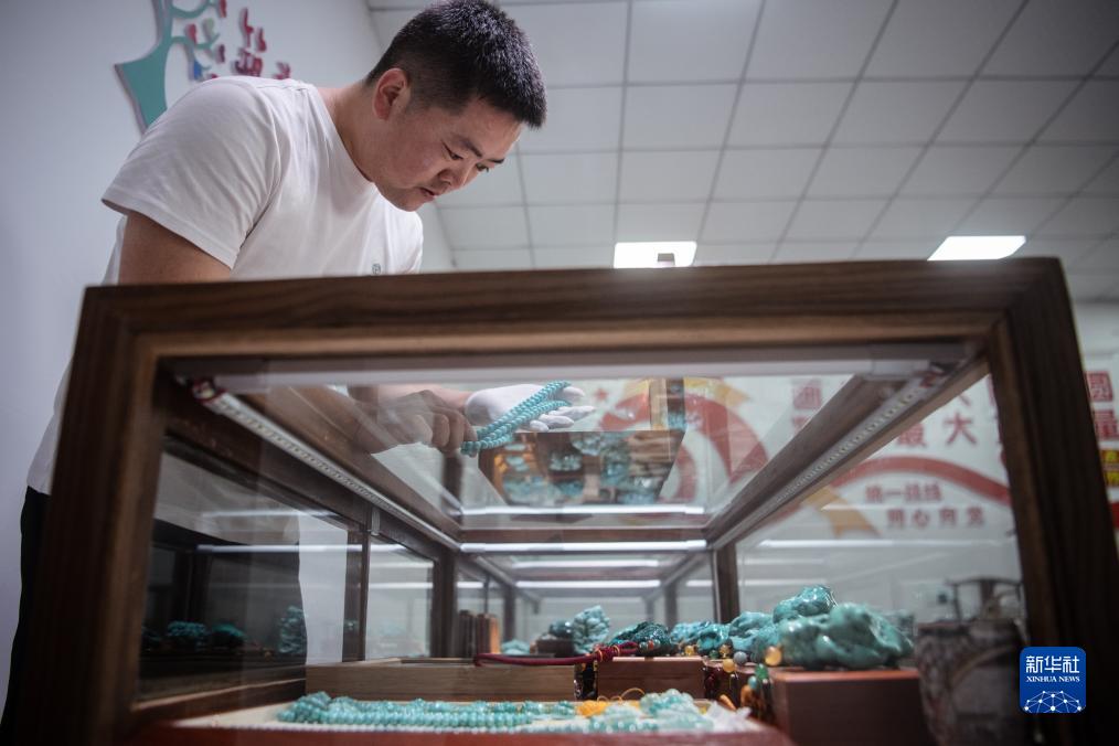 10月11日,湖北省鄖西縣下營村村民庹濤在查看展銷柜臺內的綠松石制品。