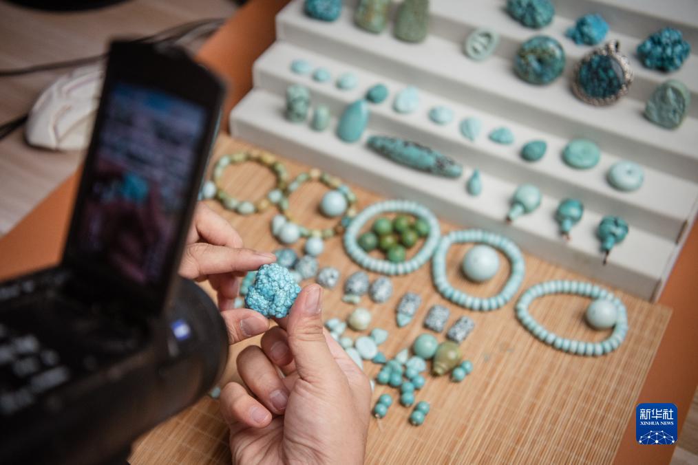 10月11日,湖北省鄖西縣下營村村民庹濤在直播銷售綠松石制品。