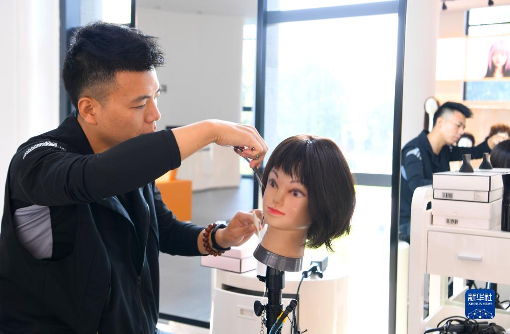 10月11日,工作人員在河南瑞貝卡發制品股份有限公司的展廳內修剪假發。