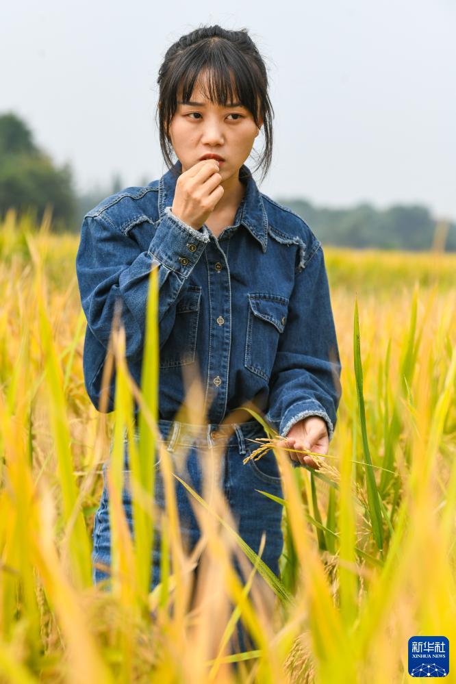 10月10日,在成都市雙流區彭鎮,王伶俐在查看今年成熟水稻的品質。