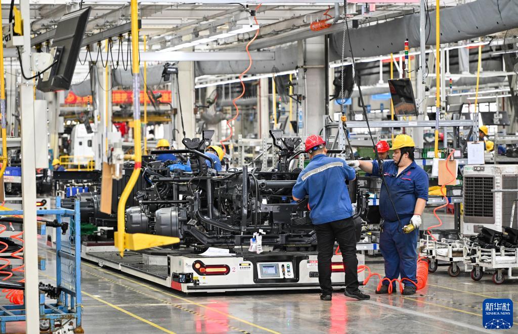 9月26日在位于重慶市兩江新區(qū)的上汽紅巖汽車有限公司總裝車間拍攝的生產(chǎn)作業(yè)現(xiàn)場(chǎng)。