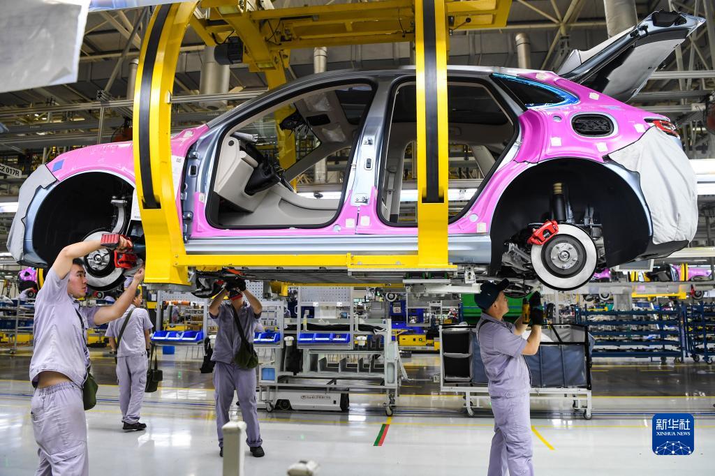 賽力斯汽車有限公司重慶兩江智慧工廠工作人員在生產車間作業(2022年6月27日攝)。