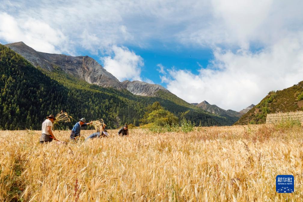 10月12日,在四川甘孜藏族自治州稻城縣亞丁村,村民在收割青稞。