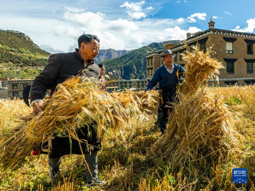 10月12日,在四川甘孜藏族自治州稻城縣亞丁村,村民將收割、捆扎好的青稞壘在一起。
