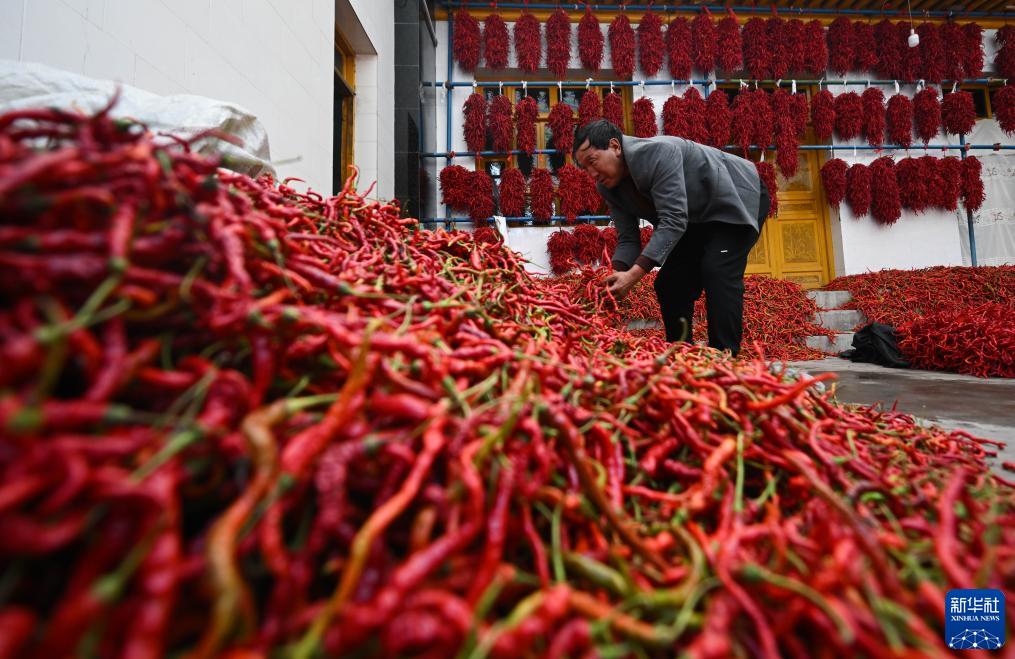 10月12日,在青海省海東市循化撒拉族自治縣清水鄉田蓋村,種植戶在晾曬線椒。