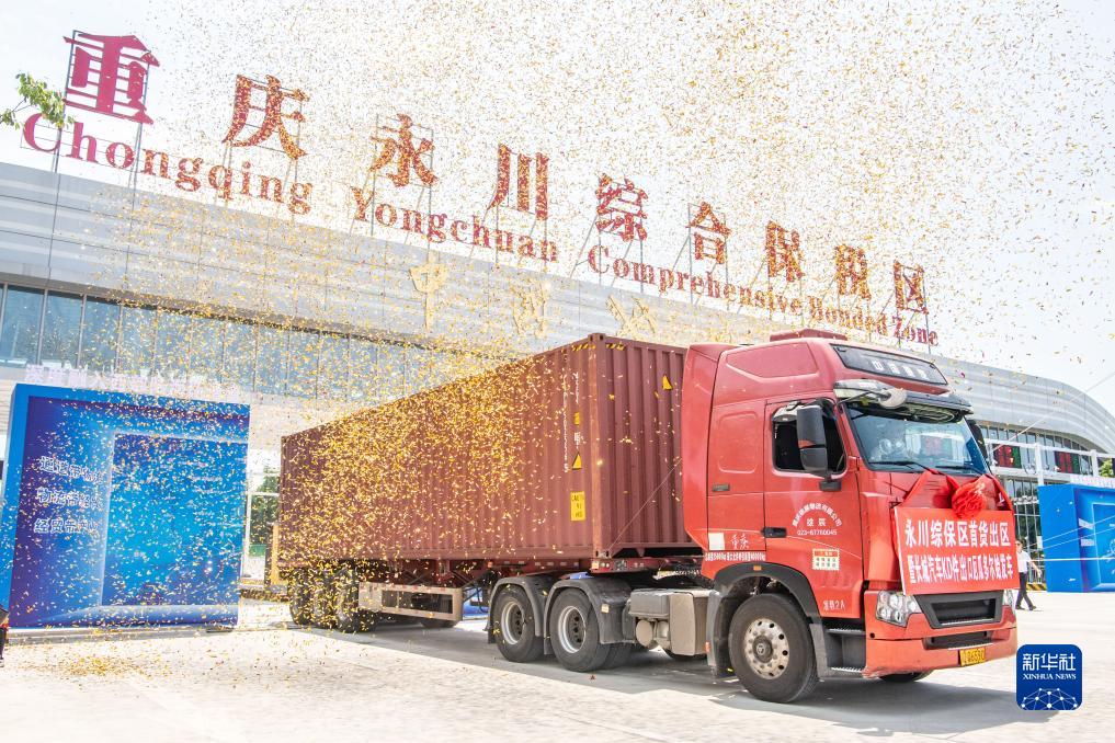 重慶永川綜合保稅區首貨出區暨長城汽車KD件出口始發車順利發車(2023年7月11日攝)。當日,重慶永川綜合保稅區首批貨物順利通關出區。該批貨物是長城汽車部分系列車型的成套零部件(簡稱KD件),將分別經由重慶團結村和重慶果園港啟運,通過鐵海聯運和江海聯運兩種方式,于7月中旬和9月抵達泰國林查班港和厄瓜多爾瓜亞基爾港。